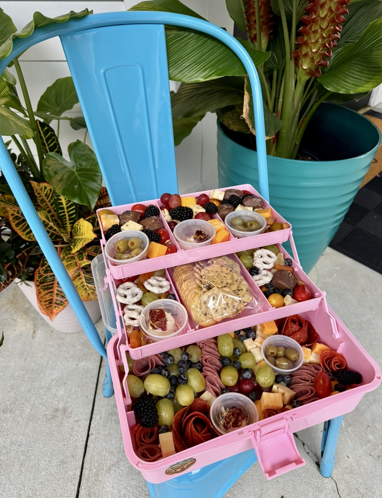 One of my absolute favorite creations we do is called a Snackle Box! This is a fun twist tacklebox and a Bento box. These are amazing for the boats and beach days as well as road trips, tailgating, or even make a fun centerpiece and conversation starter at any party.