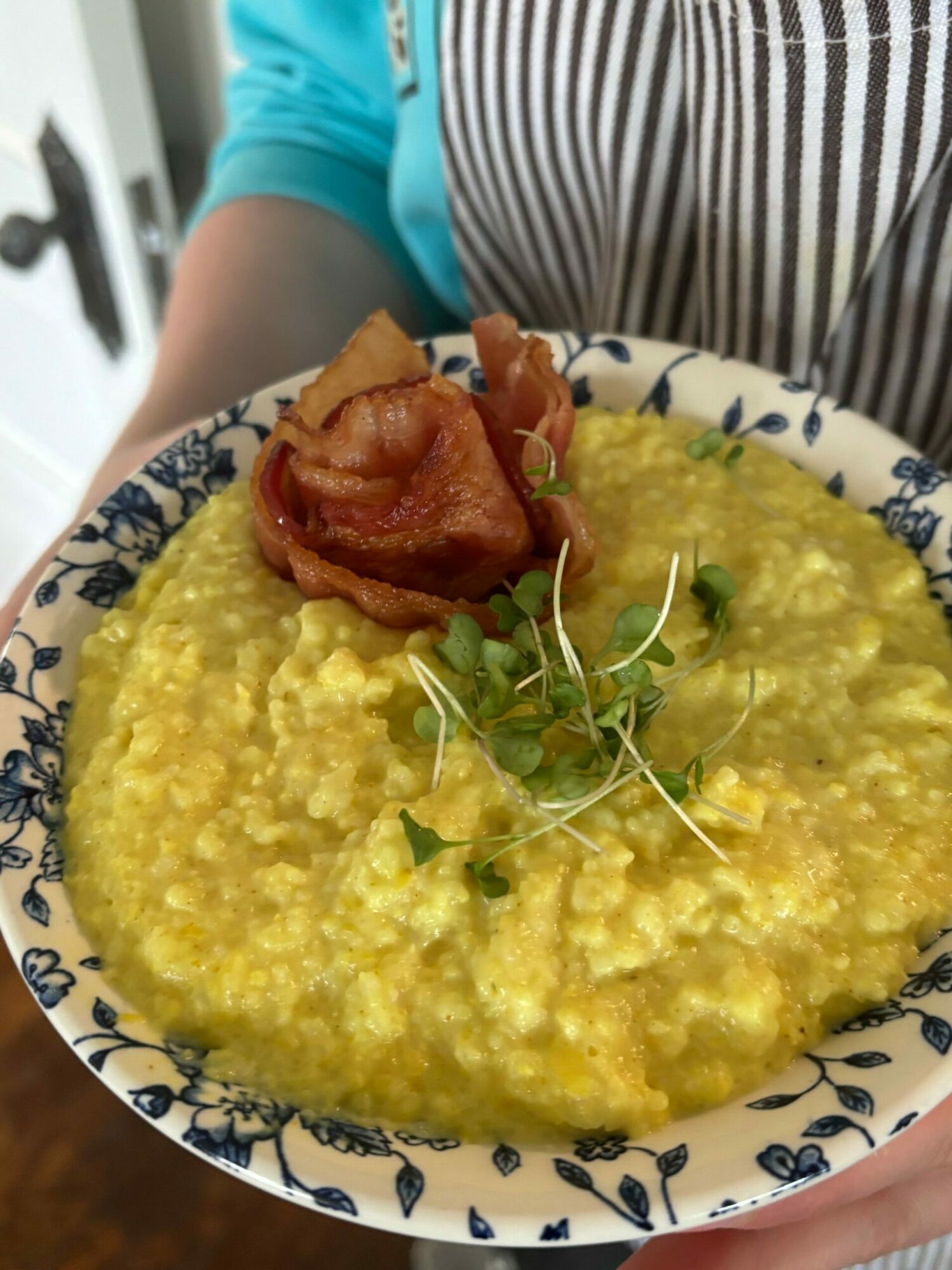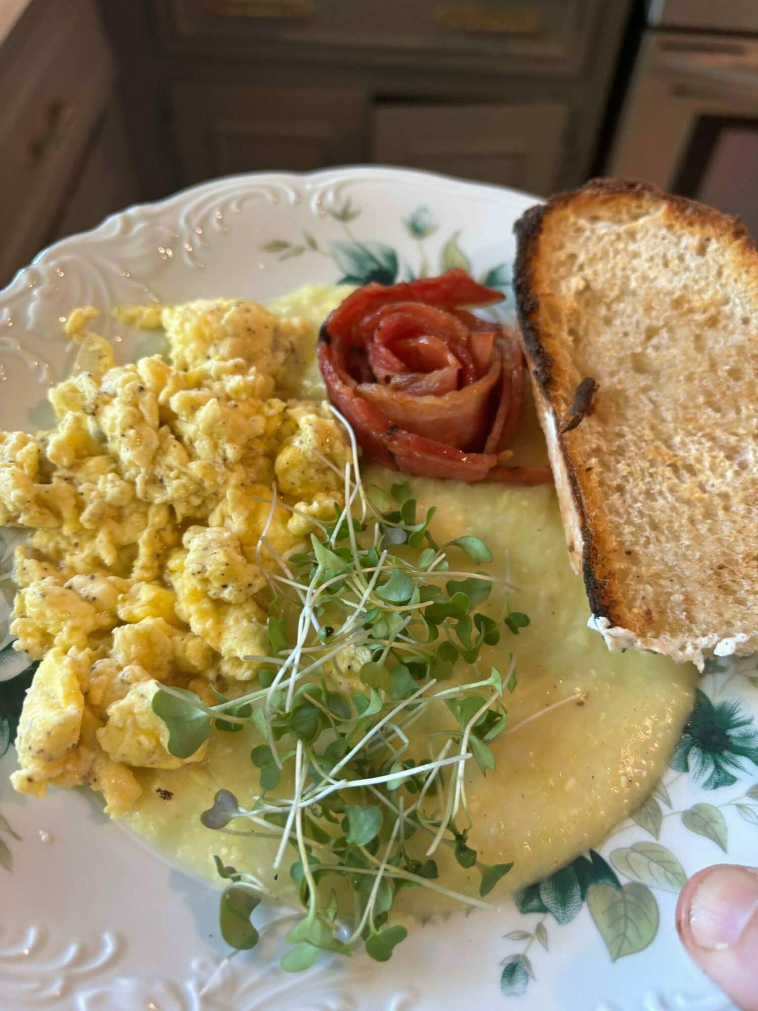 - Goodness Gouda Grits with eggs and choice of chicken sausage or bacon: $8.25